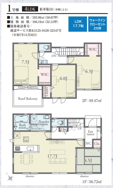 土地面積 193.96㎡(58.67坪) / 建物面積 106.19㎡ / 間取り 4LDK