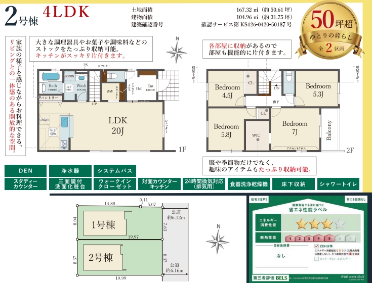 土地面積 167.32㎡(50.61坪) / 建物面積 104.96㎡ / 間取り 4LDK